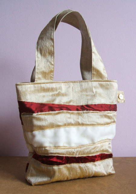 I really like it, I think it has worked very well, it is made from silk and velvet, lined with natural linen, The handles are silk on the outside and linen on the inside, and it has a magnetic closure as well. It measures 7.5″ high and 8.5″ across at the top, it has a gusset so it sits nicely, and the handles are approximately 12″ long.